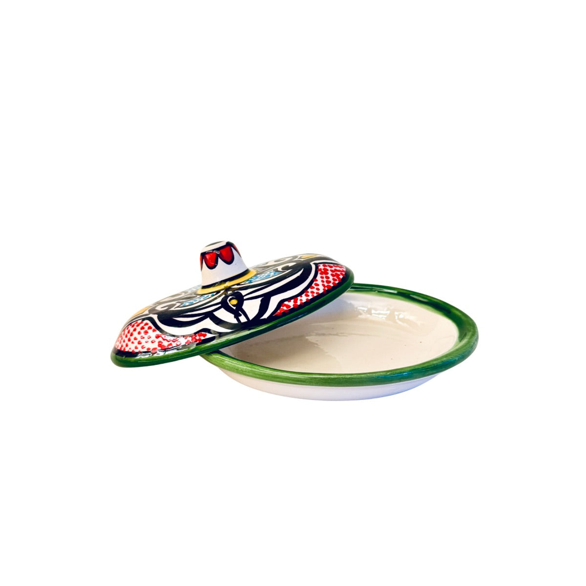 This versatile ceramic covered dish can be used to stylishly hold anything from butter, dips, nuts and olives to jewelry, coins or any other trinkets you can imagine being kept in a four inch lidded dish.