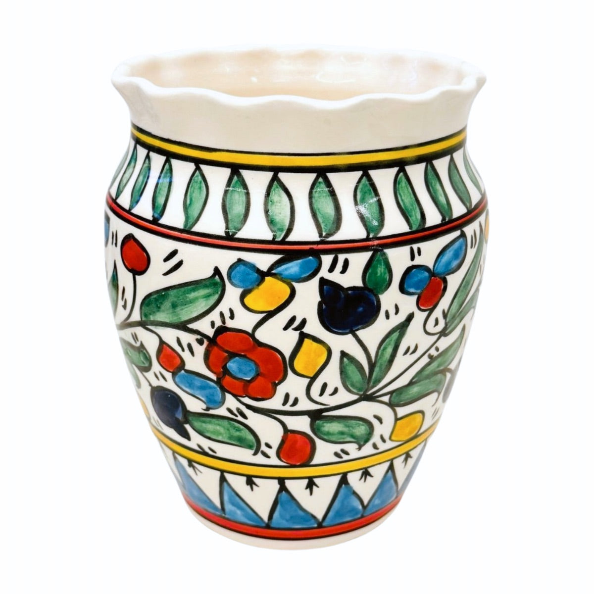 Handmade and hand-painted from the Fakhoury family in Hebron, Palestine. The Fakhoury’s come from a long line of potters and, in fact, the name Fakhoury even means “potter” in Arabic. Their shop is located in the old city of Hebron where Israeli soldiers and settlers routinely physically and verbally harass Palestinians. Despite the difficulties, the family is determined to keep their store open and their craft alive.