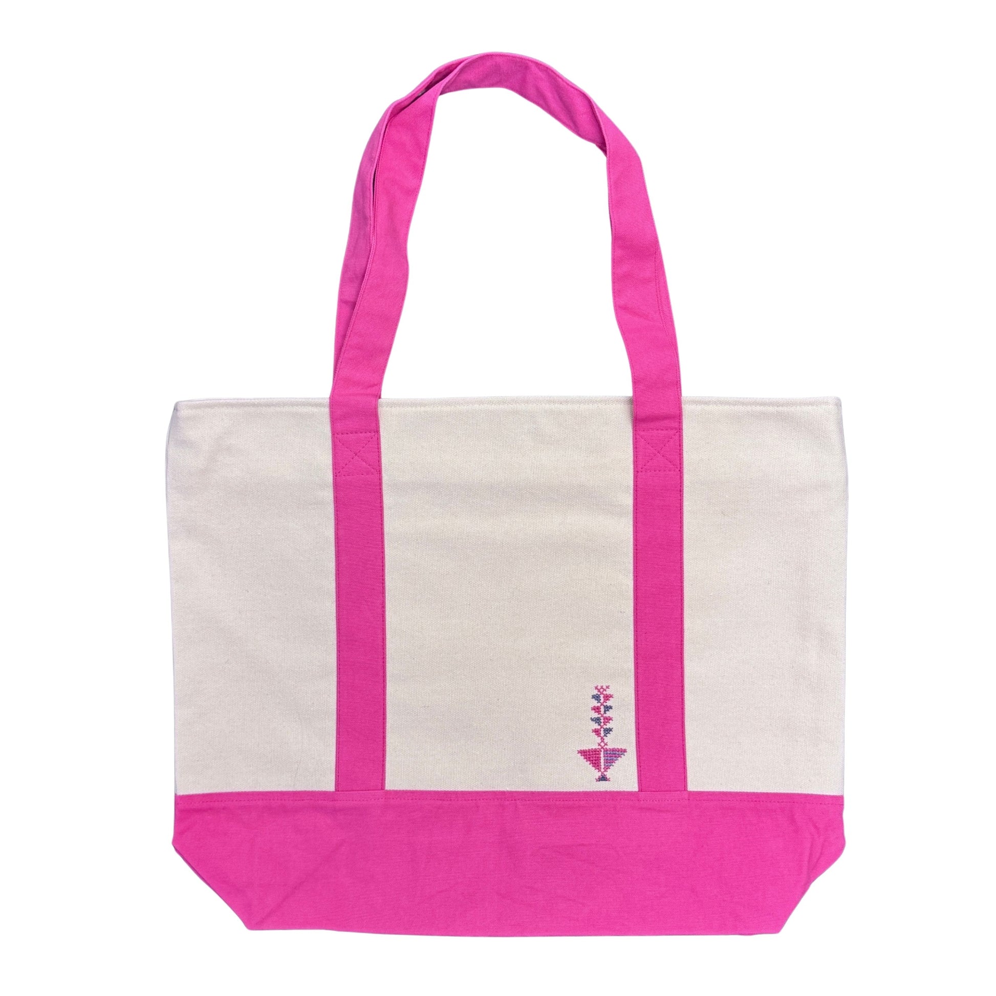 A large multi-purpose tote bag for work, beach, or shopping with a cream colored base complimented by vibrant pink. This tote features a beautiful hand stitched tatreez pattern on the front with an additional touch of embroidery on the back. Full zipper closure and a deep pocket on the front exterior. Made of 100% medium weight cotton canvas.