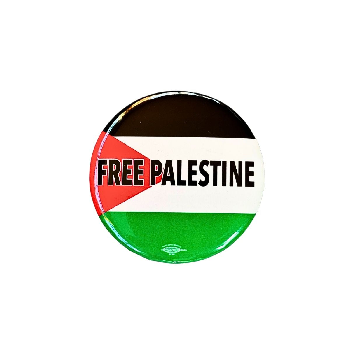 Show your solidarity with the Palestinian people by wearing this button based on the Palestinian Flag. 1 3/4 inches in diameter with a pin back including safety clasp. Includes a "union bug" on the bottom to show it was produced in a union shop.