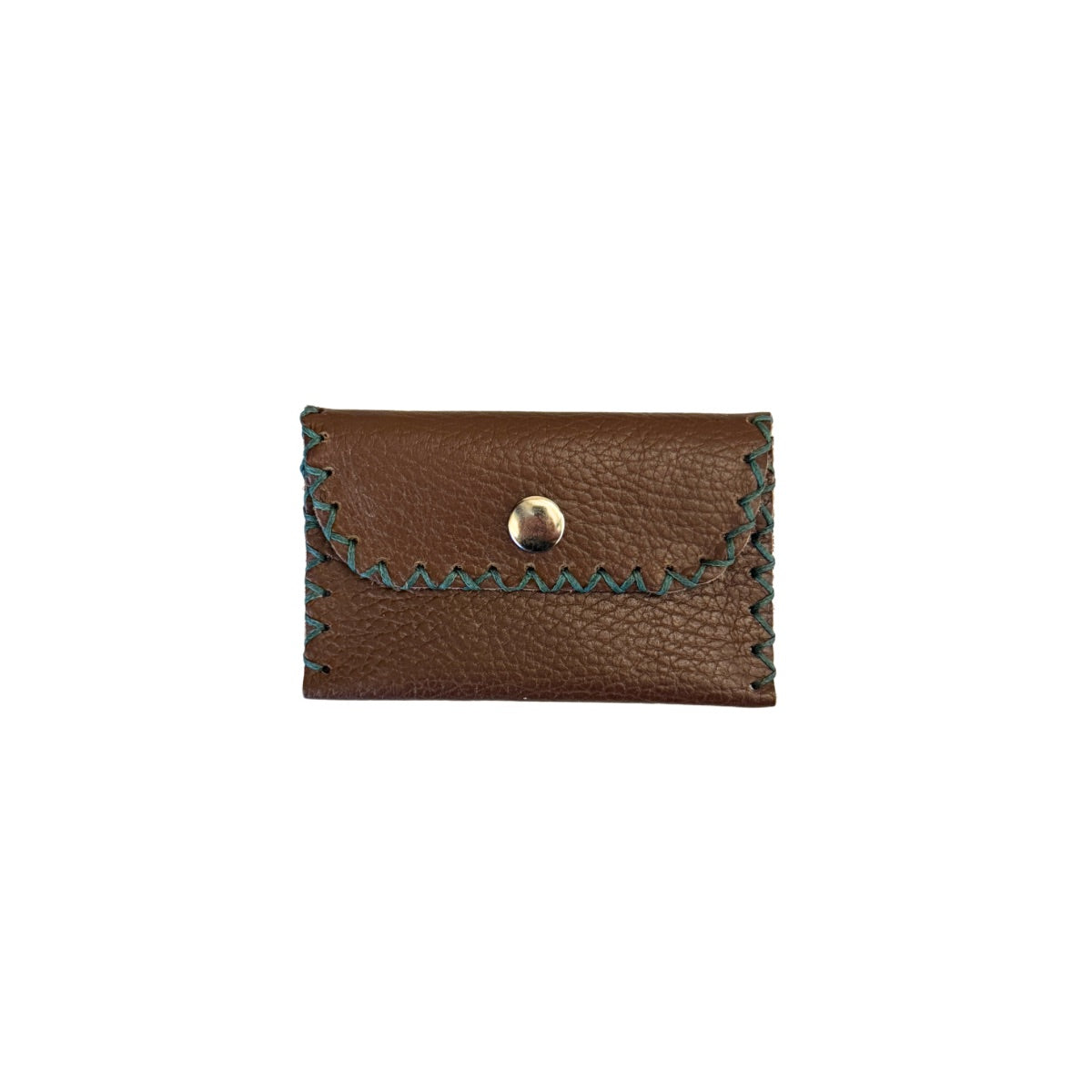 Hand stitched leather ID wallet with snap closure. Measures 4 x 2.5 Inches.