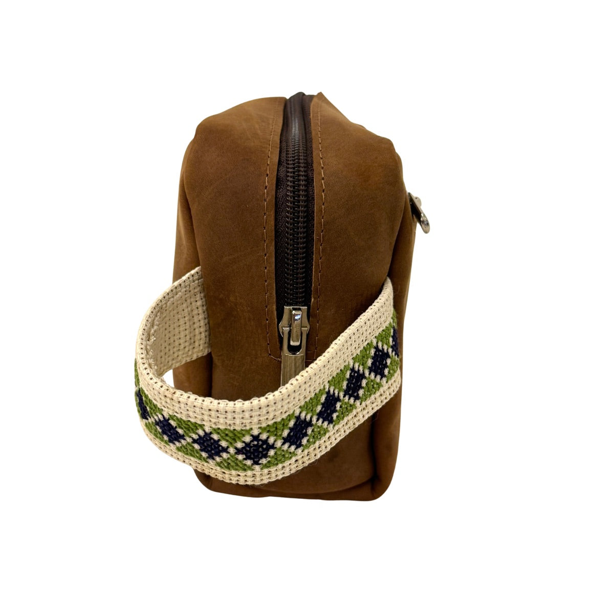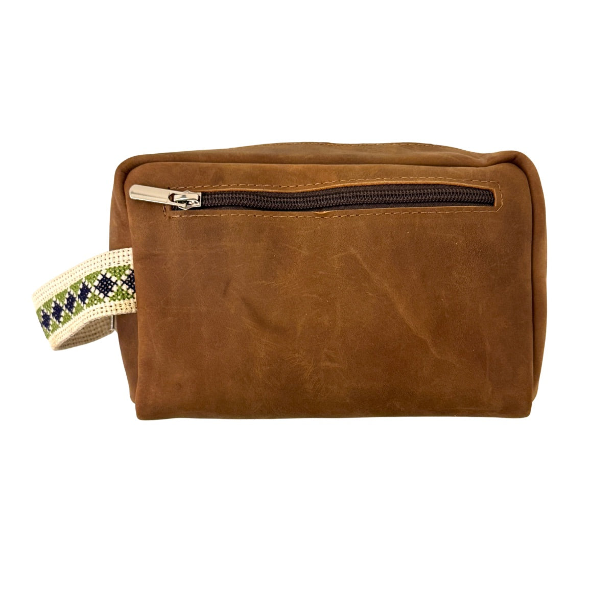 Beautiful and sturdy leather toiletry bag with zipper closure. Lined with fabric, there’s a large zipper pocket on the inside as well as on the outside.