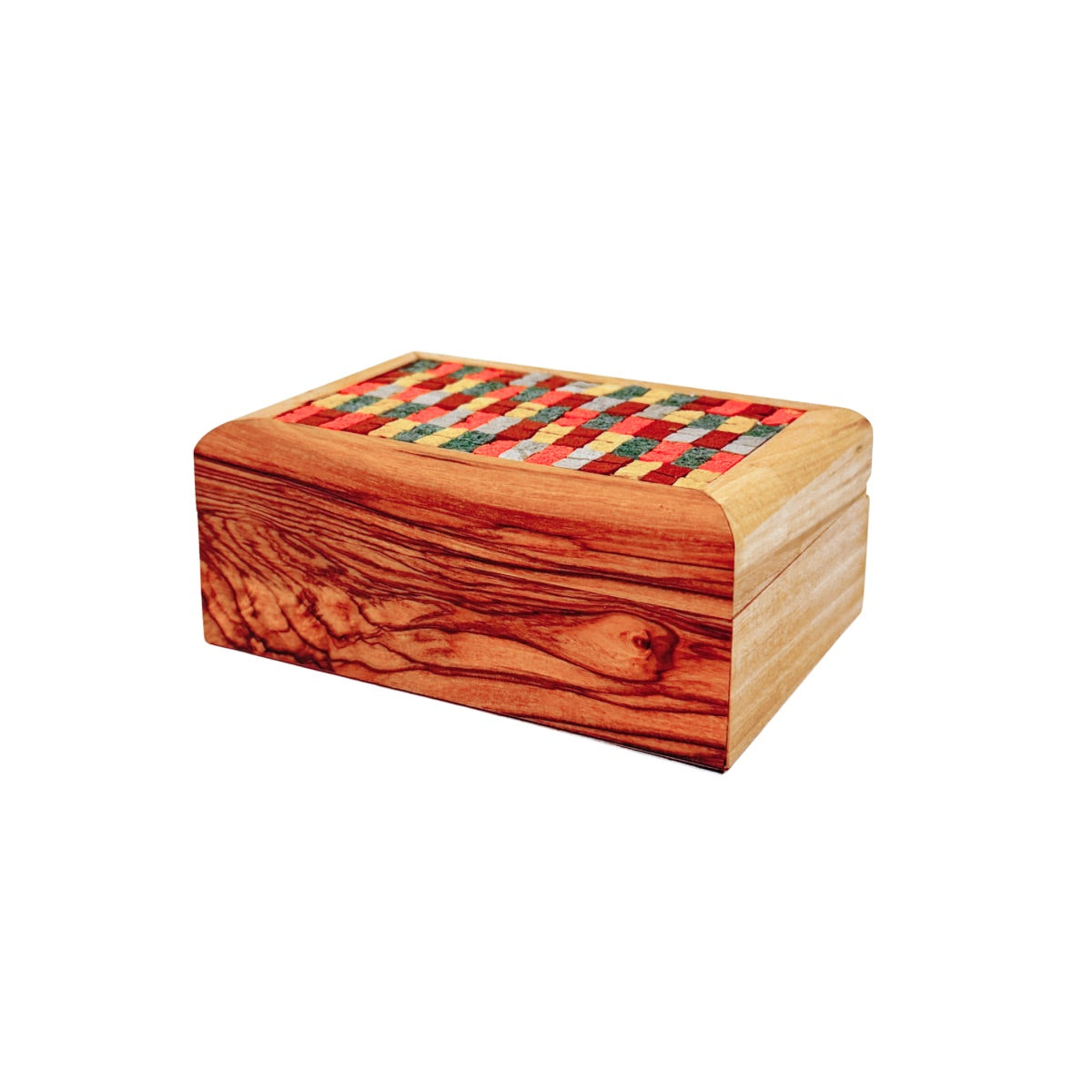 Hand crafted decorative olive wood box with a colorful glass mosaic pattern on lid. Made in Bethlehem. Approximate dimensions: 2.75“X3”