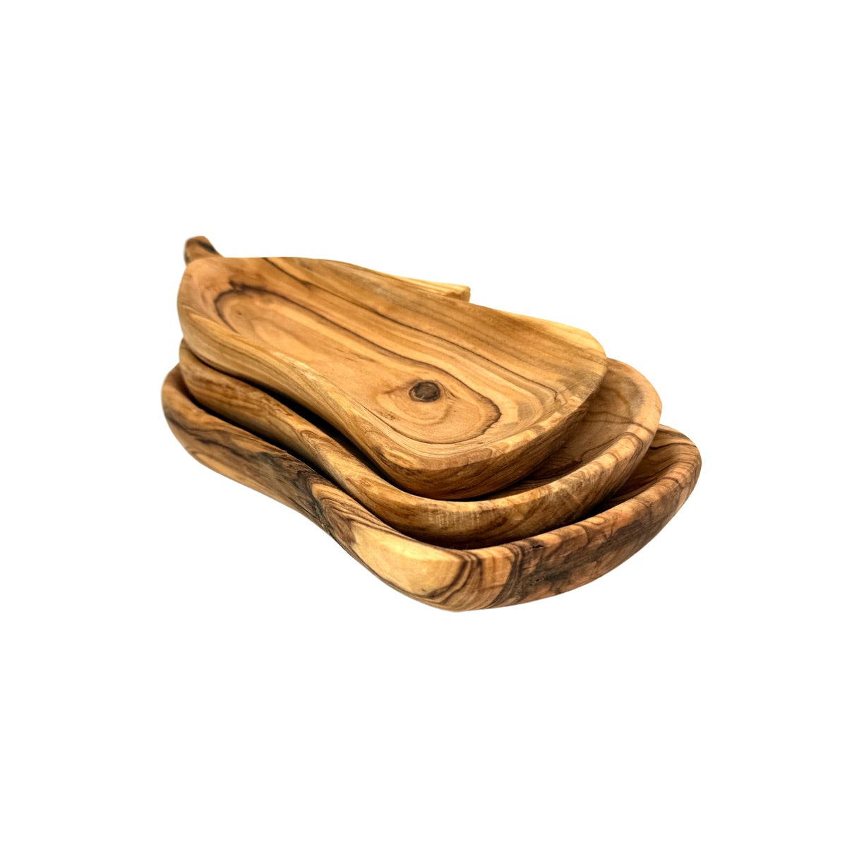 Nesting pear shaped dishes made of olive wood. Hand carved. Approximate dimensions: 5"