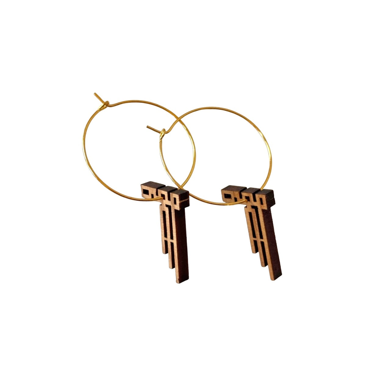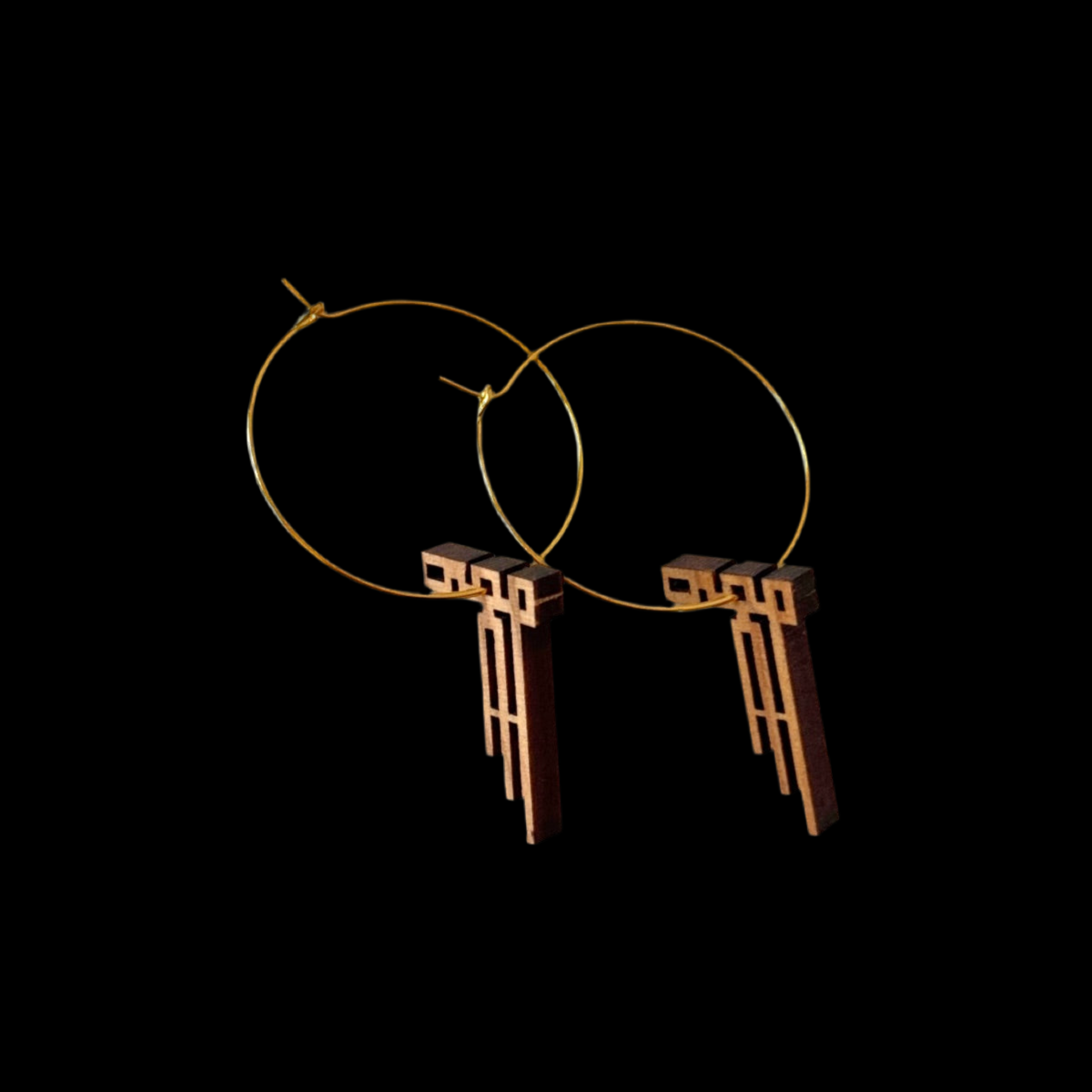 Elegant and unusual earrings with intricately crafted olivewood, featuring the Arabic words “Resilience" (Sumood),  on golden-colored hoops.