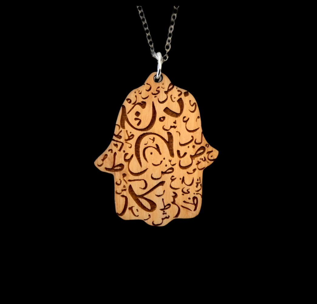 SKU: jnnh130Olive Wood Pendant Hamsa w/Arabic, Small (1.25”)
