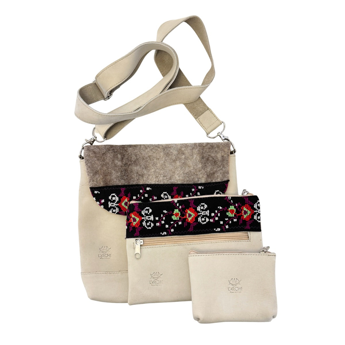 SKU: MIO798Leather Embroidered and Felted Purse (Set of 3) - Oyster