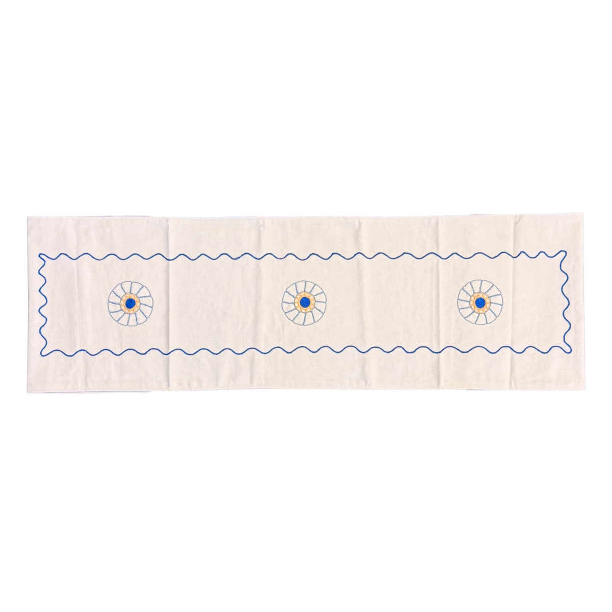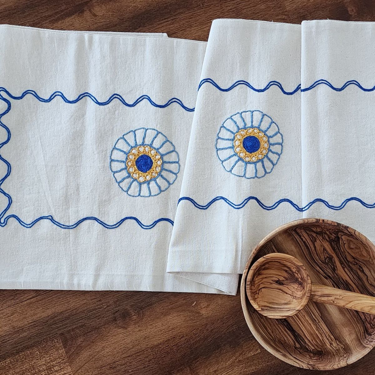 The Tahriri Tatreez Runner is hand embroidered on the front with an “evil eye” design and is made of a double layer of Mansouri cotton from Jerusalem. Designed and stitched with care by women artisans from the West Bank, each creation is completely handmade. Locally sourced materials are used to create pieces that are truly authentic and Palestinian-made. As part of their mission to supply ongoing skills training, Darzah artisans learn this unique Palestinian Tahriri embroidery style. Measurements: 70” x 15”